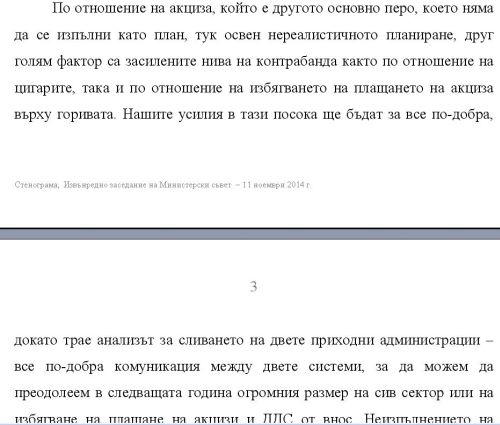 По отношение на акциза, който е другото основно перо, което няма да се изпълни като план, тук освен нереалистичното планиране, друг голям фактор са засилените нива на контрабанда както по отношение на цигарите, така и по отношение на избягването на плащането на акциза върху горивата. Нашите усилия в тази посока ще бъдат за все по-добра, докато трае анализът за сливането на двете приходни администрации – все по-добра комуникация между двете системи, за да можем да преодолеем в следващата година огромния размер на сив сектор или на избягване на плащане на акцизи и ДДС от внос. Неизпълнението на годишен размер на акциза е около 318 млн. лв. спрямо заложения за 2014 г. план.