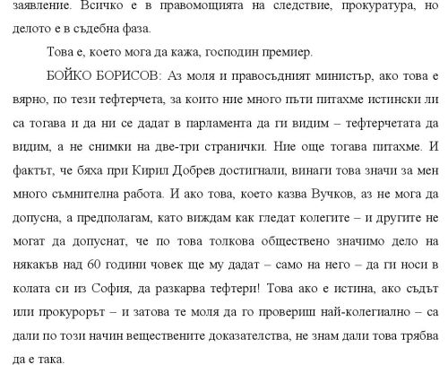 БОЙКО БОРИСОВ: Аз моля и правосъдният министър, ако това е вярно, по тези тефтерчета, за които ние много пъти питахме истински ли са тогава и да ни се дадат в парламента да ги видим – тефтерчетата да видим, а не снимки на две-три странички. Ние още тогава питахме. И фактът, че бяха при Кирил Добрев достигнали, винаги това значи за мен много съмнителна работа. И ако това, което казва Вучков, аз не мога да допусна, а предполагам, като виждам как гледат колегите – и другите не могат да допуснат, че по това толкова обществено значимо дело на някакъв над 60 години човек ще му дадат – само на него – да ги носи в колата си из София, да разкарва тефтери! Това ако е истина, ако съдът или прокурорът – и затова те моля да го провериш най-колегиално – са дали по този начин веществените доказателства, не знам дали това трябва да е така.