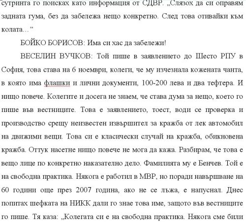 ВЕСЕЛИН ВУЧКОВ: Той пише в заявлението до Шесто РПУ в София, това става на 6 ноември, колеги, че му изчезнала кожената чанта, в която има флашки и лични документи, 100-200 лева и два тефтера. И нищо повече. Колегите и досега не знаем, че става дума за нещо, което го пише във вестниците. Това е заявлението, тоест, води се проверка и производство срещу неизвестен извършител за кражба от лек автомобил на движими вещи. Това си е класически случай на кражба, обикновена кражба. Оттук насетне нищо повече не мога да кажа. Разбирам, че това е вещо лице по конкретно наказателно дело. Фамилията му е Бенчев. Той е на свободна практика. Някога е работил в МВР, но поради навършване на 60 години още през 2007 година, ако не се лъжа, е напуснал. Днес попитах шефката на НИКК дали го знае това име, защото във вестниците го пише. Тя каза: „Колегата си е на свободна практика. Някога сме били колеги, но това беше много отдавна.“ Вписан е в списъка на вещите лица към Софийски градски съд. На него му е възложена експертиза с определение на Апелативен съд, ако не се лъжа. Аз така знам за развитието на делото. Той си е взел определението за назначаване на експертиза. Те вероятно са му дали и веществените доказателства – перифразирам, малко теоретично говоря. Той вероятно си прави някаква експертиза и сега се твърди в публикациите, че са изчезнали веществени доказателства. Това е, което мога да ви кажа, нито ще се намесваме по някакъв начин. Само попитах дали наистина има подадено такова заявление. Всичко е в правомощията на следствие, прокуратура, но делото е в съдебна фаза.