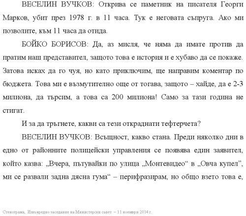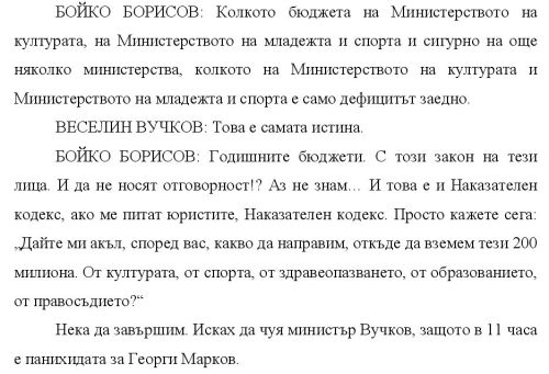 БОЙКО БОРИСОВ: Да, аз мисля, че няма да имате против да пратим наш представител, защото това е история и е хубаво да се покаже. Затова исках да го чуя, но като приключим, ще направим коментар по бюджета. Това ми е възмутително още от тогава, защото – хайде, да е 2-3 милиона, да търсим, а това са 200 милиона! Само за тази година не стигат.