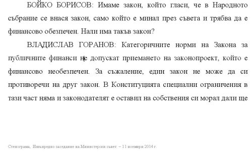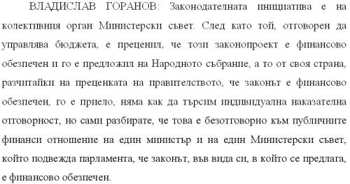 ВЛАДИСЛАВ ГОРАНОВ: Категоричните норми на Закона за публичните финанси не допускат приемането на законопроект, който е финансово необезпечен. За съжаление, един закон не може да си противоречи на друг закон. В Конституцията специални ограничения в тази част няма и законодателят е оставил на собствения си морал дали ще наруши финансовия план и безотговорно ще гласува закон, който не съвпада с разчета на бюджета, който той е приел.