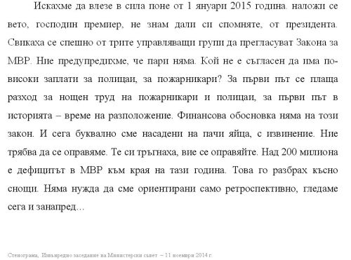 Искахме да влезе в сила поне от 1 януари 2015 година. наложи се вето, господин премиер, не знам дали си спомняте, от президента. Свикаха се спешно от трите управляващи групи да прегласуват Закона за МВР. Ние предупредихме, че пари няма. Кой не е съгласен да има по-високи заплати за полицаи, за пожарникари? За първи път се плаща разход за нощен труд на пожарникари и полицаи, за първи път в историята – време на разположение. Финансова обосновка няма на този закон. И сега буквално сме насадени на пачи яйца, с извинение. Ние трябва да се оправяме. Те си тръгнаха, вие се оправяйте. Над 200 милиона е дефицитът в МВР към края на тази година. Това го разбрах късно снощи. Няма нужда да сме ориентирани само ретроспективно, гледаме сега и занапред…