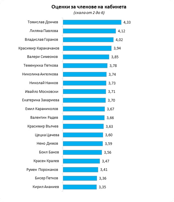 Най-висока средна оценка получава вицепремиерът Томислав Дончев, което явно е признание за експертния му образ и балансиран политически подход. Неговият резултат е добър не само сред поддръжниците на ГЕРБ но и сред по-широка политическа база в дясно-център.