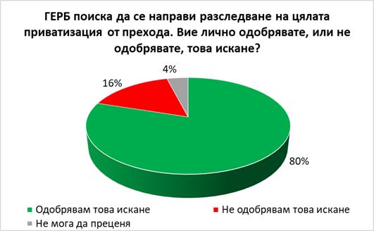 По същия начин се подкрепя и искането на ГЕРБ за разследване на приватизацията - 80% го одобряват. Както и други сондажи на „Галъп интернешънъл“ показаха, такива идеи се споделят почти автоматично.