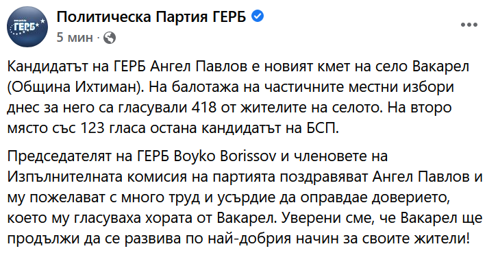 ПЪРВО В ПИК: ГЕРБ мачка на изборите във Вакарел - Бойко Борисов поздрави новия кмет
