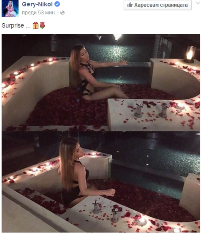 Певицата се изтипоса полугола в басейн, пълен с рози, а над фотоса бе написала „Изненада” („Surprise”).