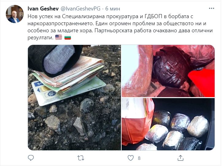 "Нов успех на Специализирана прокуратура и ГДБОП в борбата с наркоразпространението. Един огромен проблем за обществото ни и особено за младите хора. Партньорската работа очаквано дава отлични резултати", написа Гешев в Туитър.
