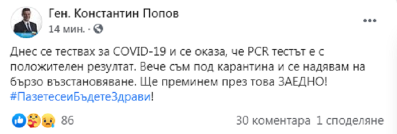 "Днес се тествах за COVID-19 и се оказа, че PCR тестът е с положителен резултат. Вече съм под карантина и се надявам на бързо възстановяване. Ще преминем през това ЗАЕДНО!", написа ген. Попов.