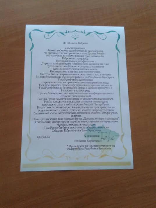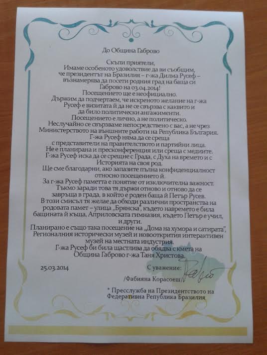 "Пише ви служителка в община Габрово, която желае да запази анонимност. Името Латинка Карагьозова не е моето истинско! Искам да запозная вашия сайт с информация, която би развълнувала много българи! Пращам ви снимки, направени с личния ми телефон, на документ, който преди известно време получихме в общината. От него става ясно, че Дилма Русеф ще посети Габрово след няколко дни. Никой от колегите ми не потвърждава тази информация, но в кметството нещо се подготвя, а кметицата е видимо развълнувана! Лично аз не смятам, че подобно нещо трябва да се крие от съгражданите ни, защото това ще бъде събитие за нашия град! Надявам се, че тази информация представлява интерес за вашата агенция!"