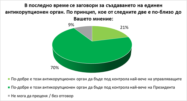 В началото на есенния политически сезон корупцията се оказва в центъра на политическия дебат, а и на законотворчеството. Ключов се очертава да бъде дебатът за контрола над предвиждания нов антикорупционен орган. Повече от две трети от българските избиратели (70%) приемат, че президентът трябва да има водеща роля в това отношение. 21% подкрепят предложението контролът да бъде в ръцете на самите управляващи.