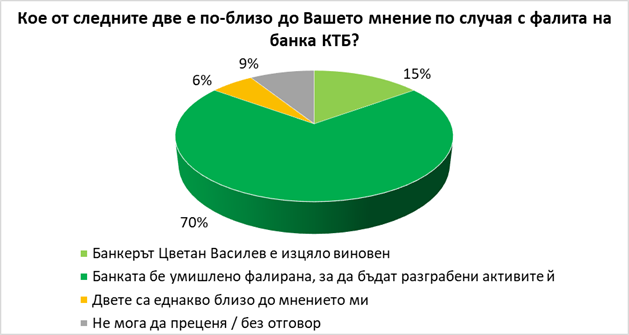 А по отношение на случая с фалита на КТБ вече се е оформила доминираща интерпретация в масовото съзнание - за 70% от пълнолетните българи банката е умишлено фалирана, за да се разграбят активите й. Всеки шести (15%) счита, че вината изцяло е на банкера Василев, а 6% са съгласни и с едното, и с другото. Подобни обществени нагласи не вещаят бързо изчезване на случая от масовото съзнание, а и от политическата борба в страната.