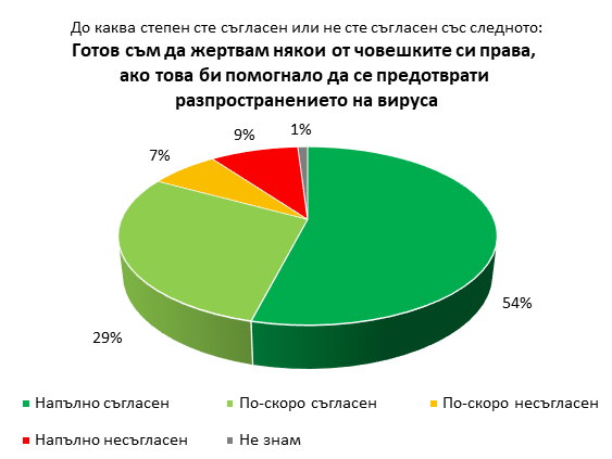 54% са съгласни, а 29% - по-скоро съгласни (сумарно 83% съгласни в различна степен) с твърдението "Готов съм да жертвам някои от човешките си права, ако това би помогнало да се предотврати разпространението на вируса". 7% не са съгласни, а 9% са твърдо несъгласни (общо 16% несъгласни в различна степен). 1% не могат да преценят.