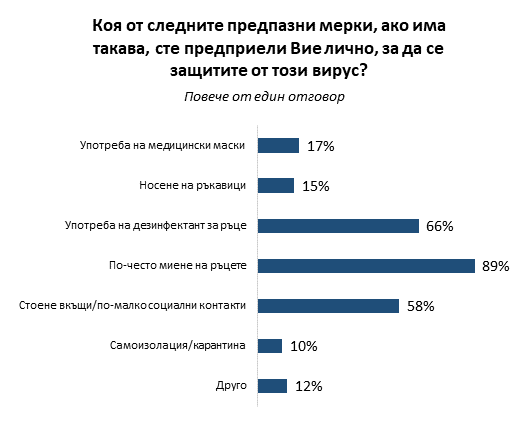 От няколко изброени на респондентите немедикаментозни мерки, най-често споменаваните действия, които хората твърдят, че вече са предприели, са: по-често миене на ръце (споменавано в 89% от случаите), използване на дезинфектант за ръце (66%), намаляване на социалните контакти и оставане вкъщи (58%), маски (17%), ръкавици (15%), доброволна карантина (10%), 12% назовават различни други мерки като дезинфекция, витамини и т.н. Обезпокояващо е, че в тази група попадат и отговори, които съдържат "пиене на ракия" – те са общо 2% от цялата извадка. Дори и респондентите да влагат известна ирония, това е директен показател и за зловредното влияние на спекулации и фалшификати, разпространявани в социалните мрежи.