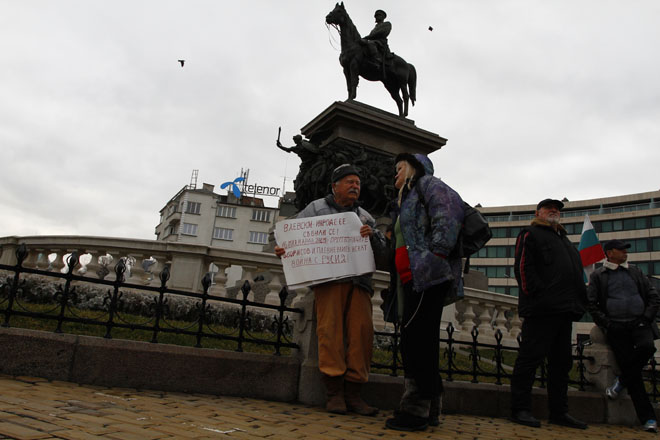 Хората са се събрали около паметника на Цар Освободител и развяват партийни знамена и трикольори.