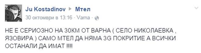 „НЕ Е СЕРИОЗНО НА 30КМ ОТ ВАРНА ( СЕЛО НИКОЛАЕВКА , ЯЗОВИРА ) САМО МТЕЛ ДА НЯМА 3G ПОКРИТИЕ, А ВСИЧКИ ОСТАНАЛИ ДА ИМАТ !!!!“