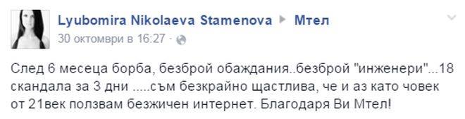 „След 6 месеца борба, безброй обаждания..безброй "инженери"...18 скандала за 3 дни .....съм безкрайно щастлива, че и аз като човек от 21век ползвам безжичен интернет. Благодаря Ви Мтел!“