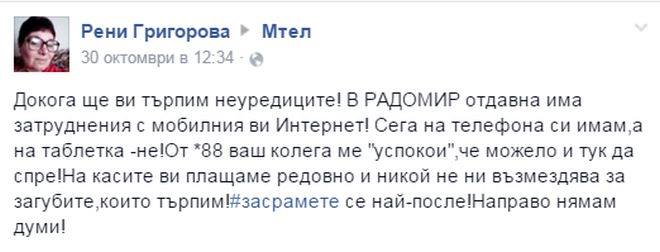 „Докога ще ви търпим неуредиците! В РАДОМИР отдавна има затруднения с мобилния ви Интернет! Сега на телефона си имам, а на таблета -не!От *88 ваш колега ме "успокои", че можело и тук да спре! На касите ви плащаме редовно и никой не ни възмездява за загубите, които търпим! #засрамете се най-после! Направо нямам думи!“