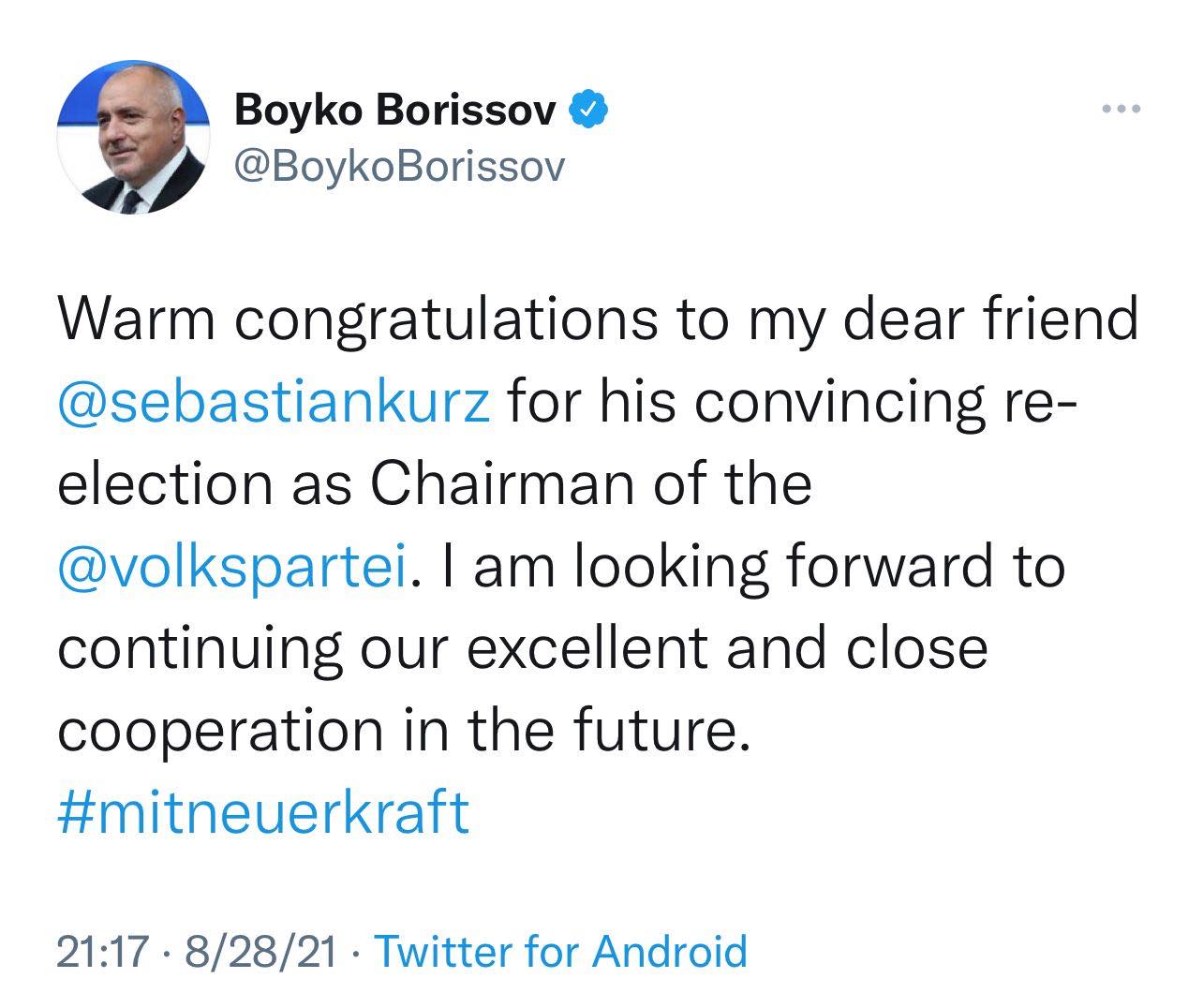 "Сърдечни поздравления за моя скъп приятел Себастиан Курц за неговото убедително преизбиране като председател на Австрийската народна партия. Очаквам с нетърпение да продължим нашето отлично и близко сътрудничество в бъдеще", написа Борисов в профила си в Туитър.