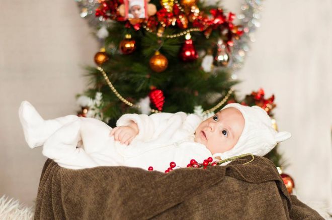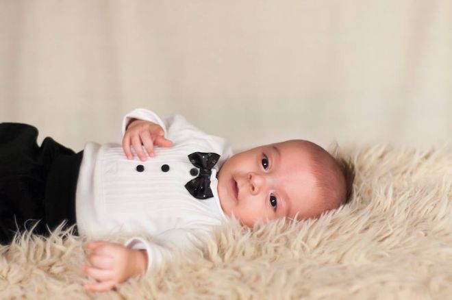 За снимките бебето е облечено в сладко черно-бяло костюмче, а Меги грижовно му е сложила и папионка. 60-дневното момченце е заснето пред коледна елха, а до него са мама и татко.