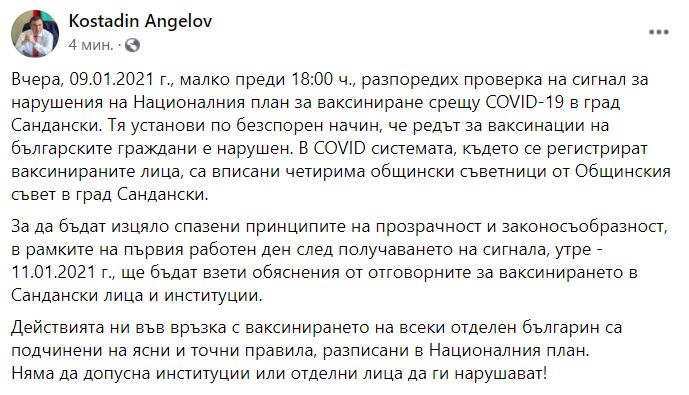 Вчера, 09.01.2021 г., малко преди 18:00 ч., разпоредих проверка на сигнал за нарушения на Националния план за ваксиниране срещу COVID-19 в град Сандански. Тя установи по безспорен начин, че редът за ваксинации на българските граждани е нарушен. В COVID системата, където се регистрират ваксинираните лица, са вписани четирима общински съветници от Общинския съвет в град Сандански.