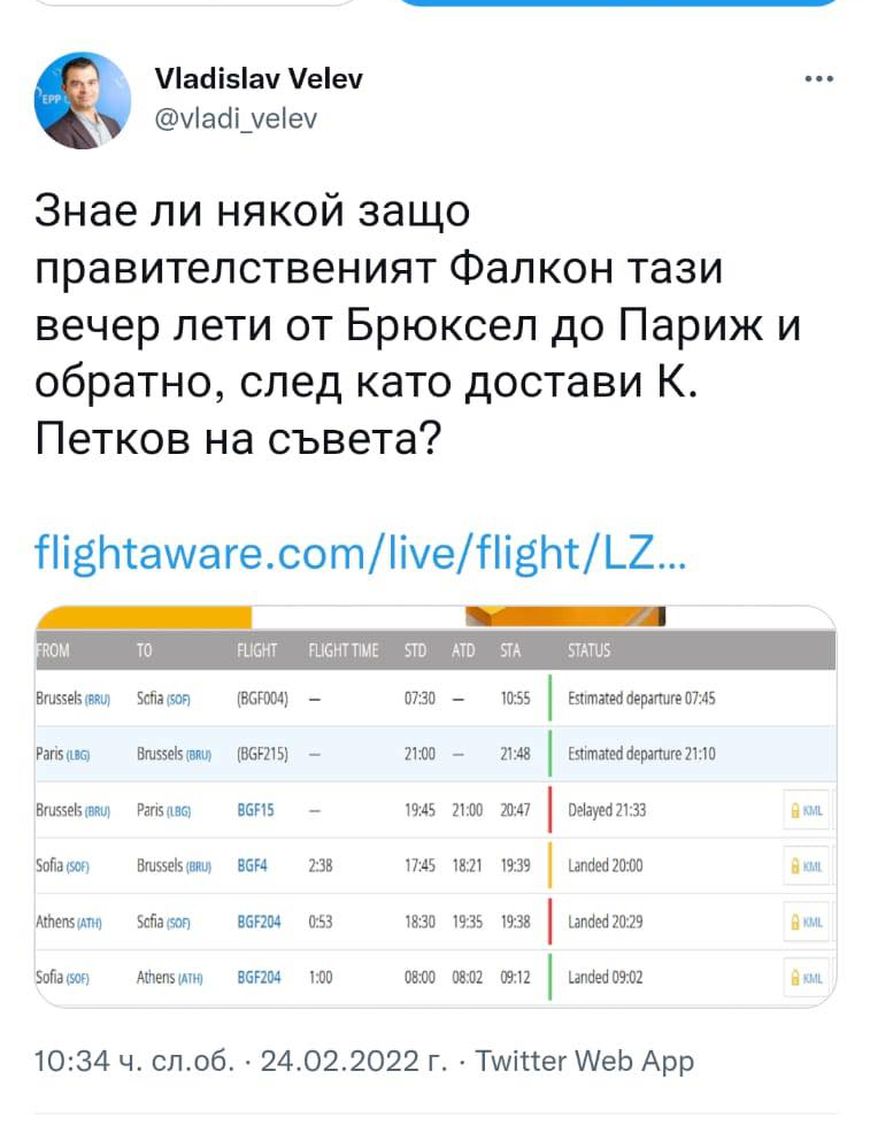 "Знае ли някой защо правителственият Фалкон тази вечер лети от Брюксел до Париж и обратно, след като достави К. Петков на съвета", пита в Туитър журналистът Владислав Велев.