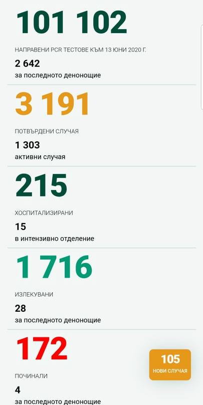 Нов рекорд на новозаразени с коронавирус отчете преди минути Единната информационна система, видя ПИК. За вчерашния 12 юни у нас са регистрирани 105 нови случая. Общо направените проби за деня са 2642.