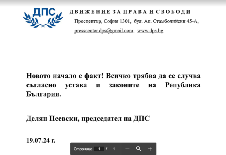 От пресцентъра на парламентарнага група на ДПС до медиите беше разпространено съобщение. В него мистериозно, председателят на групата Делян Пеевски заявява, че новото начало, за което той говори повече от две седмици, вече е факт.