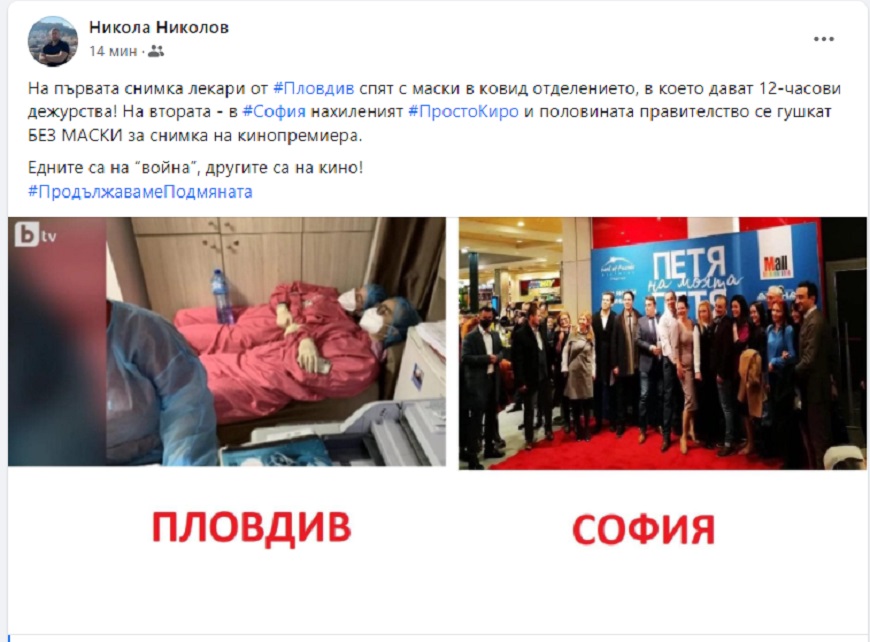 Пиарът на ГЕРБ Никола Николов публикува гневен пост в профила си във Фейсбук за правителството на Кирил Петков. Николов показа снимка на лекари от Пловдив, които спят с маски в ковид отделението меду смените, и я съпостави със снимката на премиера и част от министрите му пред киносалон снощи.