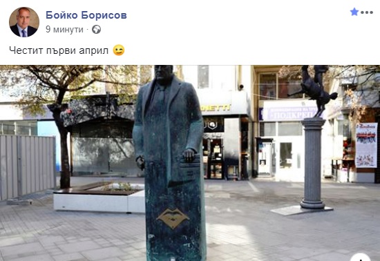 Министър-председателят на България Бойко Борисов показа за пореден път, че има чувство за хумор и честити на последователите си 1 април, Деня на шегата. Премиерът сподели статия на на БНР със заглавие "Пластмасов паметник на Бойко Борисов се появи на площад "Гарибалди" на 1 април.