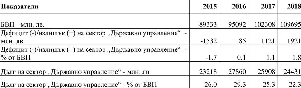 "Според окончателните данни на НСИ - Национален статистически институтза 2018 година отчитаме бюджетен излишък от 1 921 млн. лв., което е 1.8% от БВП. Продължава и положителната тенденция дългът на сектор „Държавно управление“ да намалява като достига 22,3% от БВП.