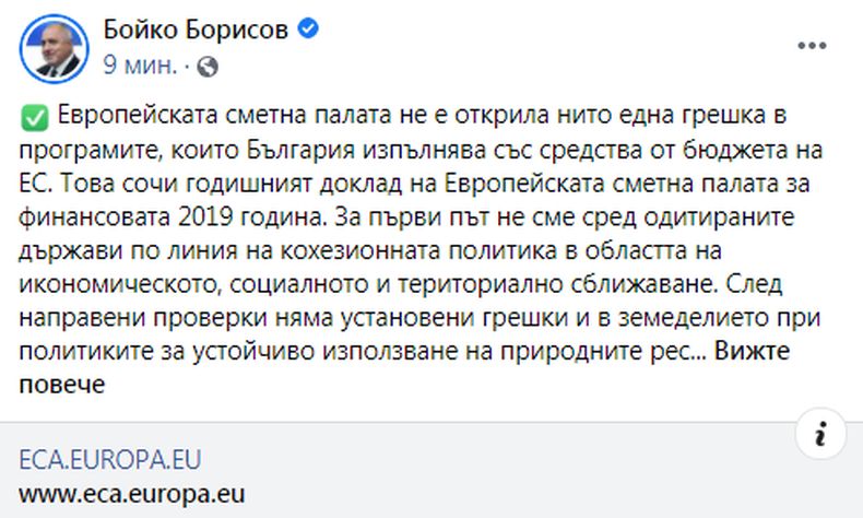 "Европейската сметна палата не е открила нито една грешка в програмите, които България изпълнява със средства от бюджета на ЕС. През последните години извървяхме дълъг път, за да върнем доверието на нашите европейски партньори в България. Не беше далеч времето, когато бяха замразени средства по предсъединенителните програми ИСПА, ФАР и САПАРД заради проблеми с корупцията. Хората помнят как и през 2013 бяха спрени еврофондовете при кабинета "Орешарски". Това написа премиерът Бойко Борисов в профила си във "Фейсбук". Отличната новина за България той съобщи навръх имения си ден.