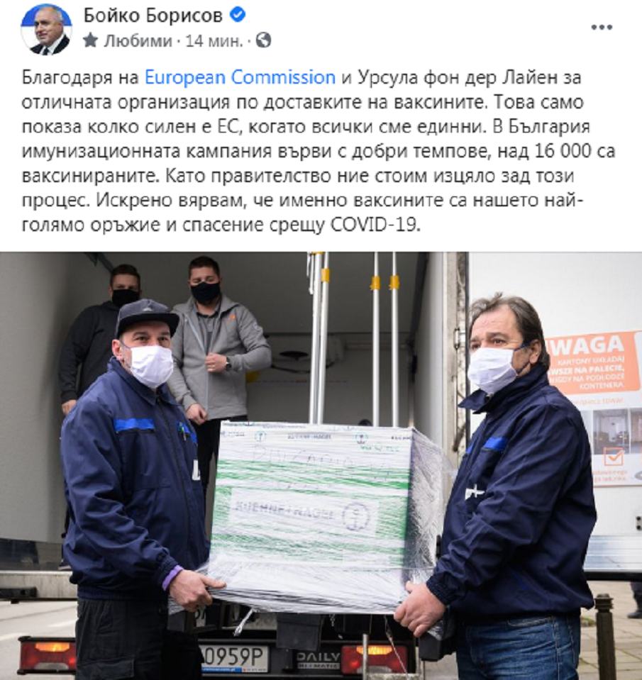 "В България имунизационната кампания върви с добри темпове, над 16 000 са ваксинираните. Като правителство ние стоим изцяло зад този процес. Искрено вярвам, че именно ваксините са нашето най-голямо оръжие и спасение срещу COVID-19", написа още Бойко Борисов.