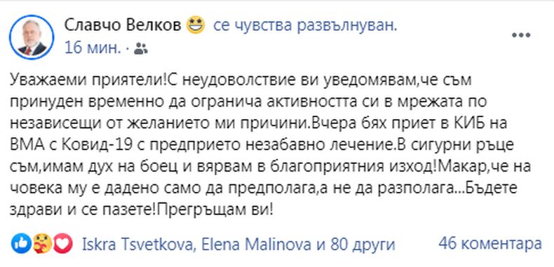 Уважаеми приятели!С неудоволствие ви уведомявам,че съм принуден временно да огранича активността си в мрежата по независещи от желанието ми причини.Вчера бях приет в КИБ на ВМА с Ковид-19 с предприето незабавно лечение. В сигурни ръце съм,имам дух на боец и вярвам в благоприятния изход!Макар,че на човека му е дадено само да предполага,а не да разполага...Бъдете здрави и се пазете!Прегръщам ви!