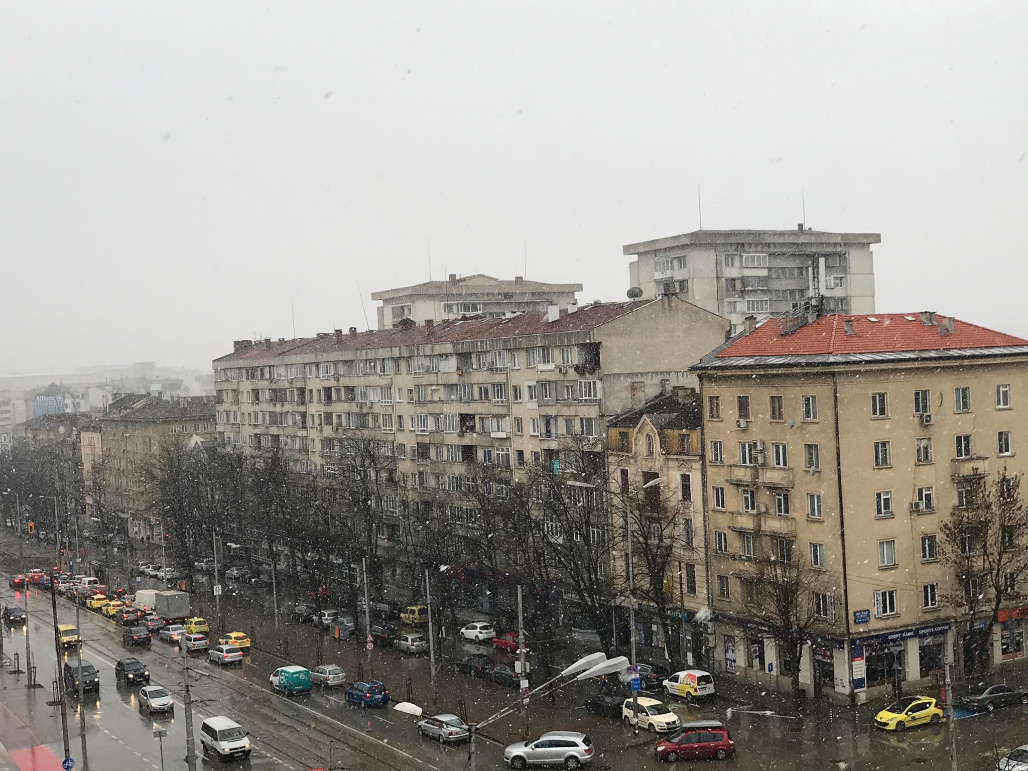 Сняг на парцали заваля в столицата преди минути. От половин час над София прехвърчат едри снежинки, придружени със студен вятър.