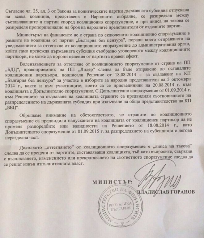 В писмото си министър Горанов дава да се разбере, че напускането на предизборната коалиция не обезсилва споразумението, но може да доведе до преразпределение на субсидията между шестте партии без партия Лидер (БДЦ).