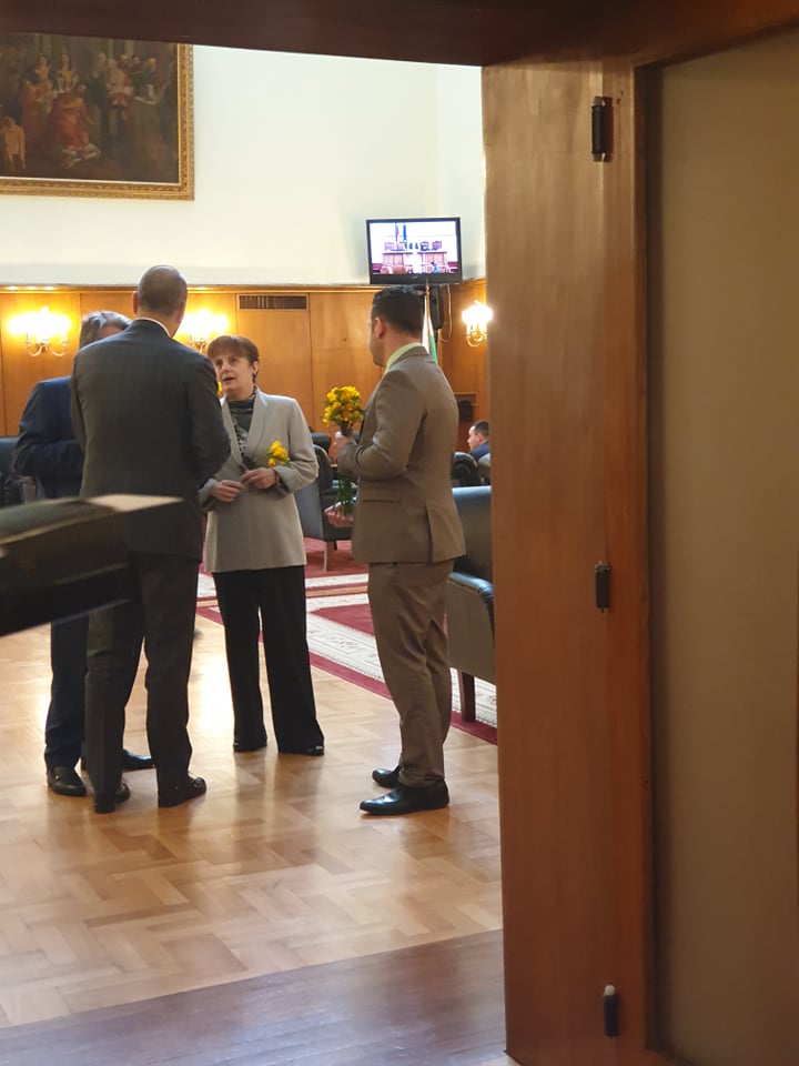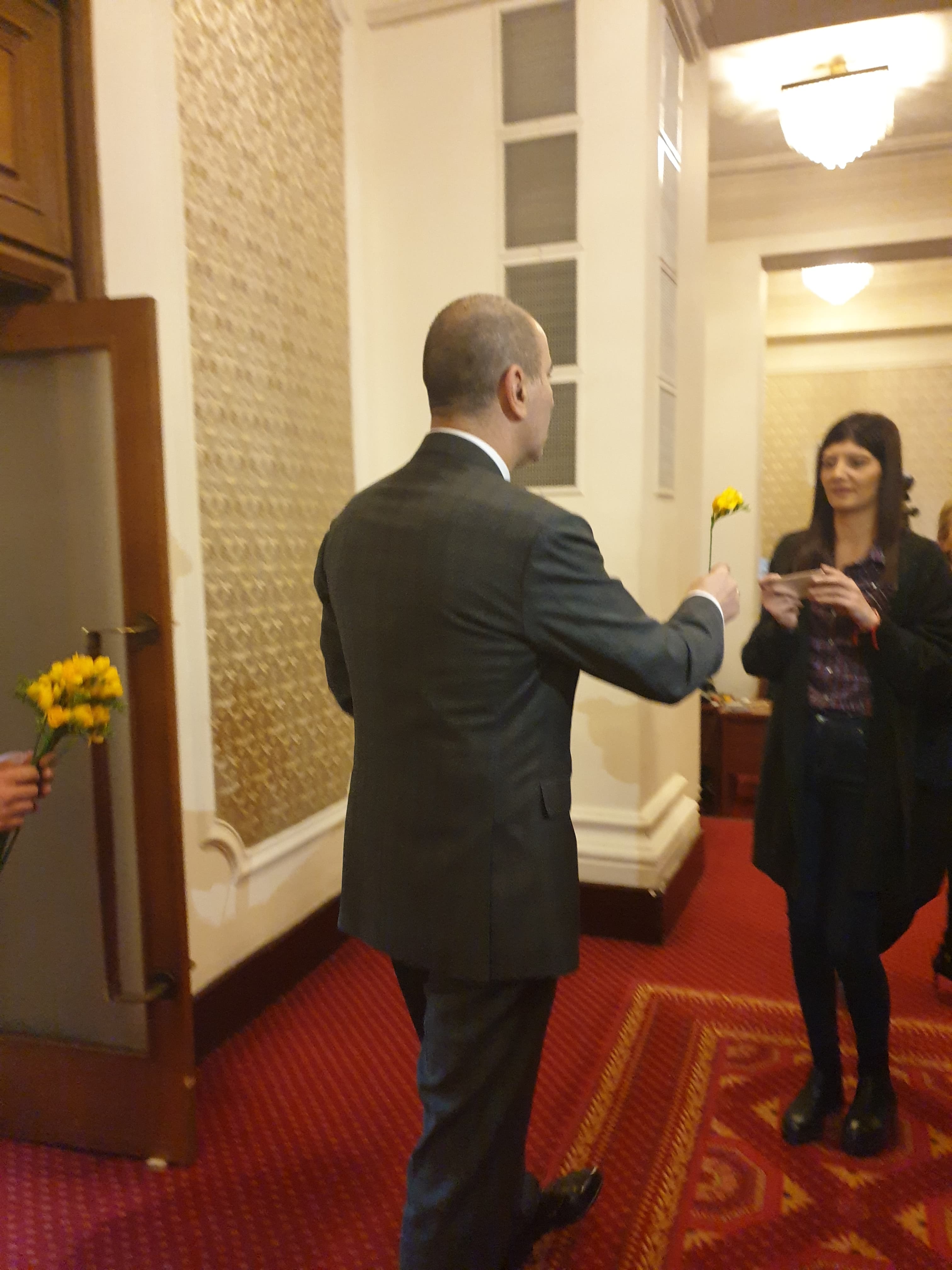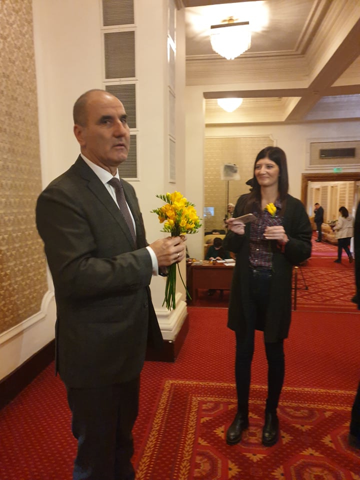 Лидерът на групата на ГЕРБ заедно с актьора Евгени Будинов поднесоха, както най-искрени пожелания, така и жълти фрезии, на всяка жена в парламента, независимо дали е журналист, депутат или от работещите във ведомството дами.