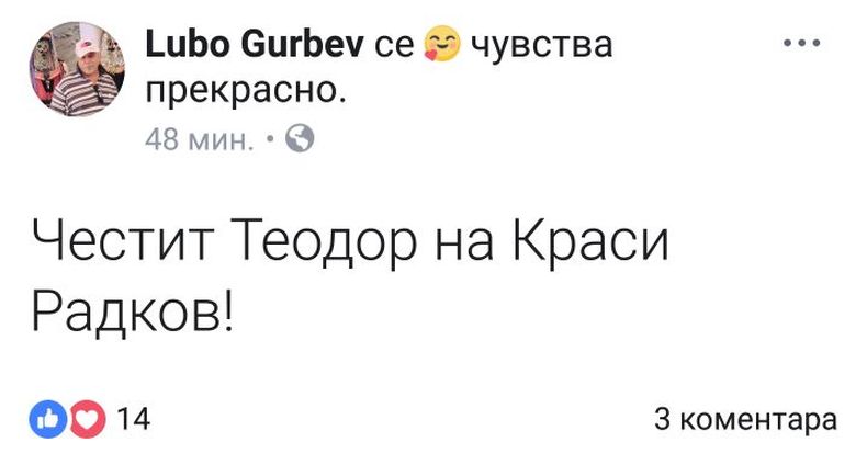 Актьорът от "Шоуто на Слави" Краси Радков е станал баща. Щастливата новина съобщи във Фейсбук преподавателят му по правоговор в НАТФИЗ Любо Гърбев.