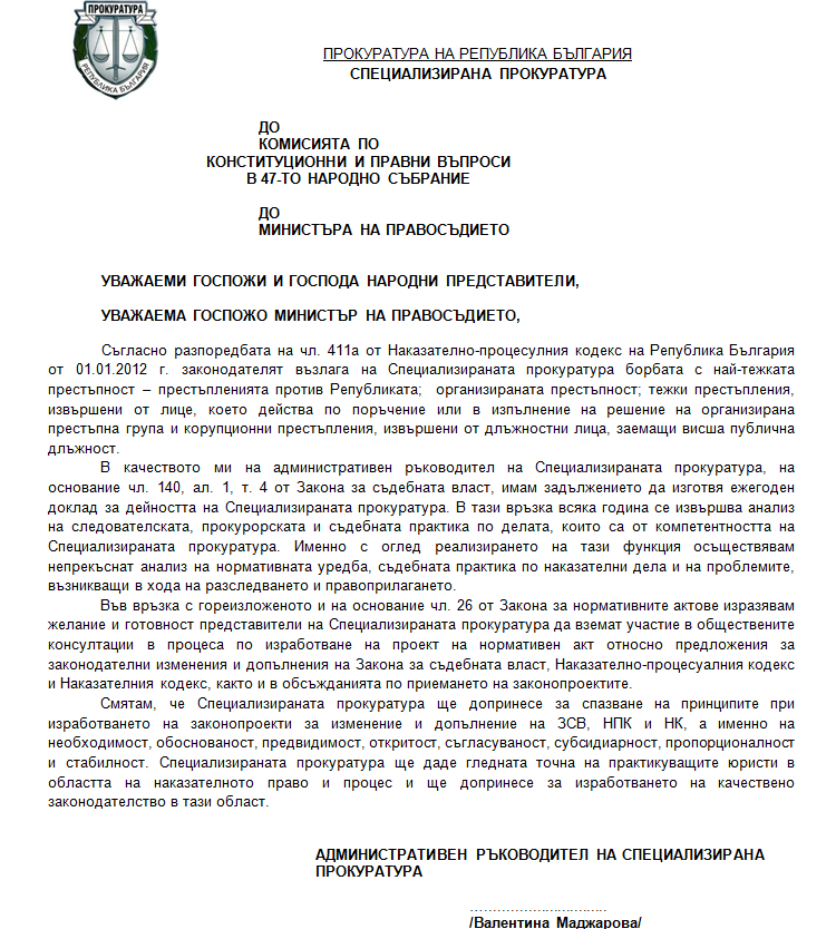 Специализираната прокуратура ще даде гледната точна на практикуващите юристи в областта на наказателното право и процес и ще допринесе за изработването на качествено законодателство в тази област", се посочва в писмото.