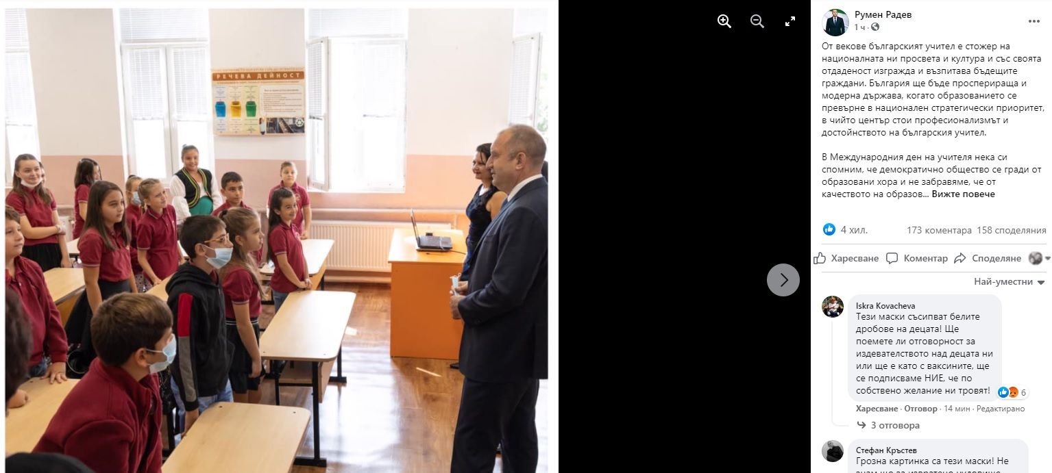 Радев използва профила си във Фейсбук, за да поздрави българските преподаватели, като за илюстративна снимка използва кадър, на който се виждат предимно той и невръстни ученици, пред които говори.