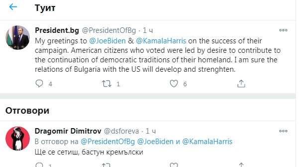 Когато все пак става ясно, че вятърът духа натам, българският президент се изявява особено нагаждачески, като забравя дори да спази етикета - вместо да честити на Байдън на български, както изисква протокола за държавен глава, той написа честитката си на английски.