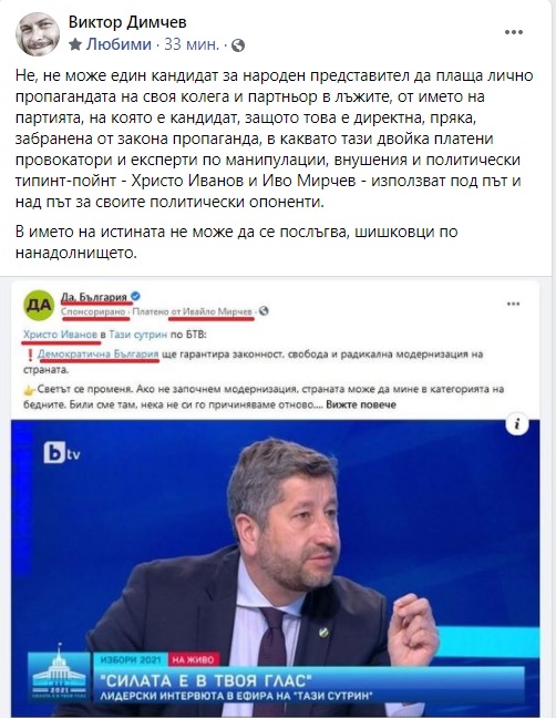 "Не, не може един кандидат за народен представител да плаща лично пропагандата на своя колега и партньор в лъжите, от името на партията, на която е кандидат, защото това е директна, пряка, забранена от закона пропаганда, в каквато тази двойка платени провокатори и експерти по манипулации, внушения и политически типинт-пойнт - Христо Иванов и Иво Мирчев - използват под път и над път за своите политически опоненти.