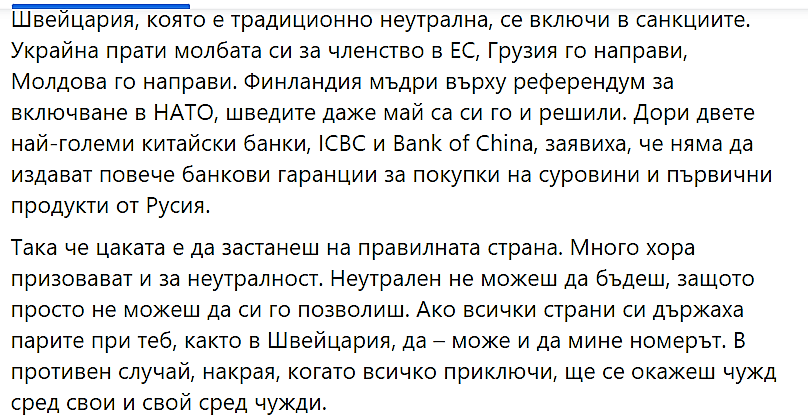 „Единствената неточност на Петков в изявлението, че Русия е бензиностанция и ракети, е, че го сподели пред камери. Същото са ми го казвали десетки китайци толкоз пъти през годините, че се чудя дали не се познават и с Петков и той да го е чул от тях“, пише многозначително Цън Цон. Впрочем, Кирил Петков пе и единственият поименно споменат в текста на Цън Цон.