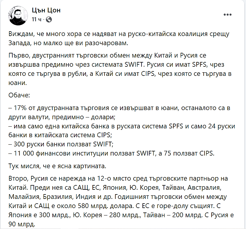 Първо, двустранният търговски продан сред Китай и Русия се прави най-вече посредством системата SWIFT. Русия си имат SPFS, посредством която се търгува в рубли, а Китай си имат CIPS, посредством която се търгува в юани“.