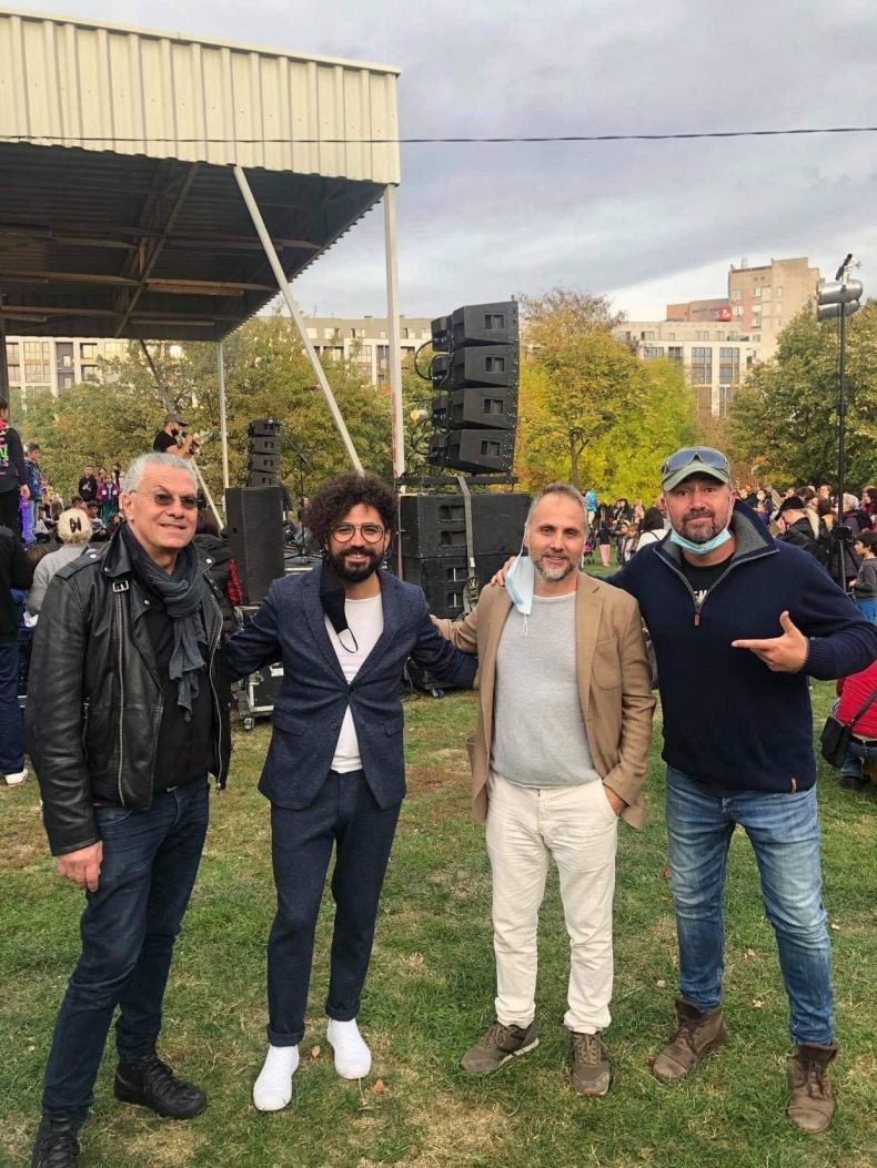 От ляво на дясно: Иван Лечев, Игор Дамянов, Стефан Стефанов и Стефан Вълдобрев, прегърнати и на сантиметри един от друг на общинския концерт, организиран от кмета на "Младост" часове преди положителния му тест за COVID-19.