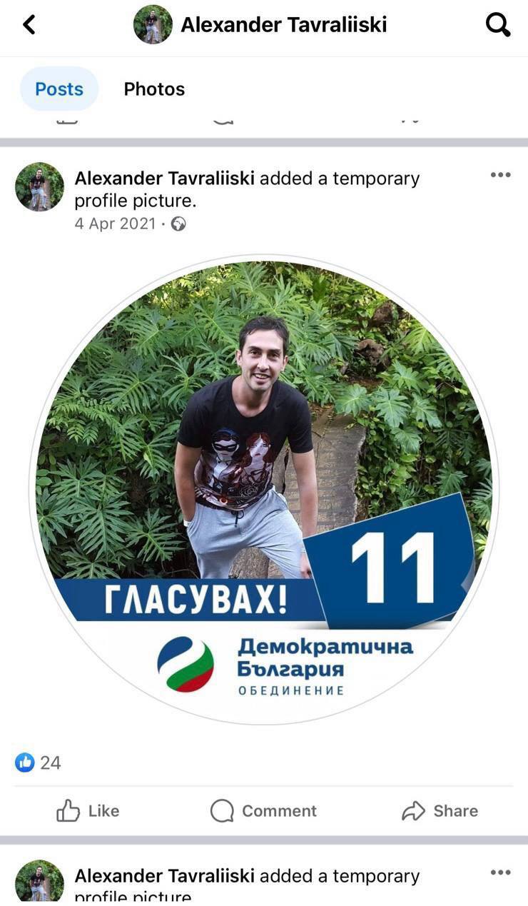 Проверка в социалните мрежи показва, че профилът на Тавралийски изобилства с предизборна агитация за "Демократична България" назад в годините.