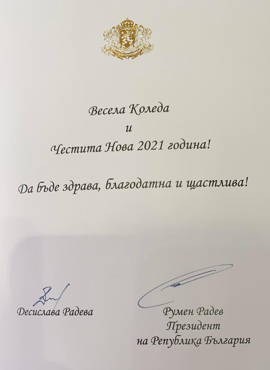 От Коледната и Новогодишна картичка на държавния глава на България за 2021 г. се вижда, че на първо място е подписана Радева, а едва след нея избраният за президент неин съпруг. Всъщност, честитката е същата и като тази за 2019 г. Тогава Радева отново демонстрира нахалството си, подписвайки се преди президента и въпреки скандала, сега той се повтаря.