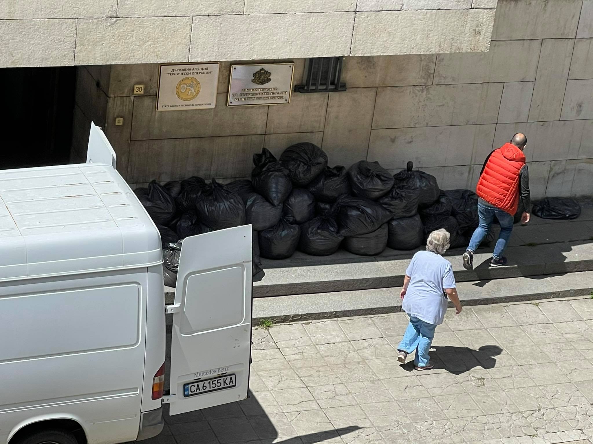 Мъже и една жена носят многобройните чували и ги товарят на бял бус, се вижда от снимките на сайта 5gmediа.bg. Действието се развива на ул. Шести септември, където е сградата на МВР. Акцията е протекла точно 10 минути, за които чувалите са били натоварени.