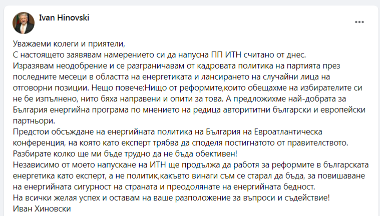 "Независимо от моето напускане на ИТН ще продължа да работя за реформите в българската енергетика като експерт, а не политик, какъвто винаги съм се старал да бъда, за повишаване на енергийната сигурност на страната и преодолянате на енергийната бедност. На всички желая успех и оставам на ваше разположение за въпроси и съдействие!", пише Иван Хиновски.
