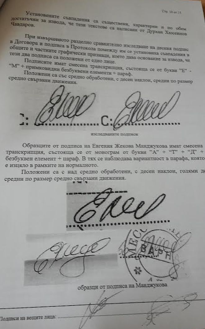 От документите става ясно, че е направена почеркова експертиза, която установя, че почеркът на Евгения Манджукова положен под договора за цесия е автентичен. По случая е назначена и експертиза от СДВР, която достига до същите изводи.