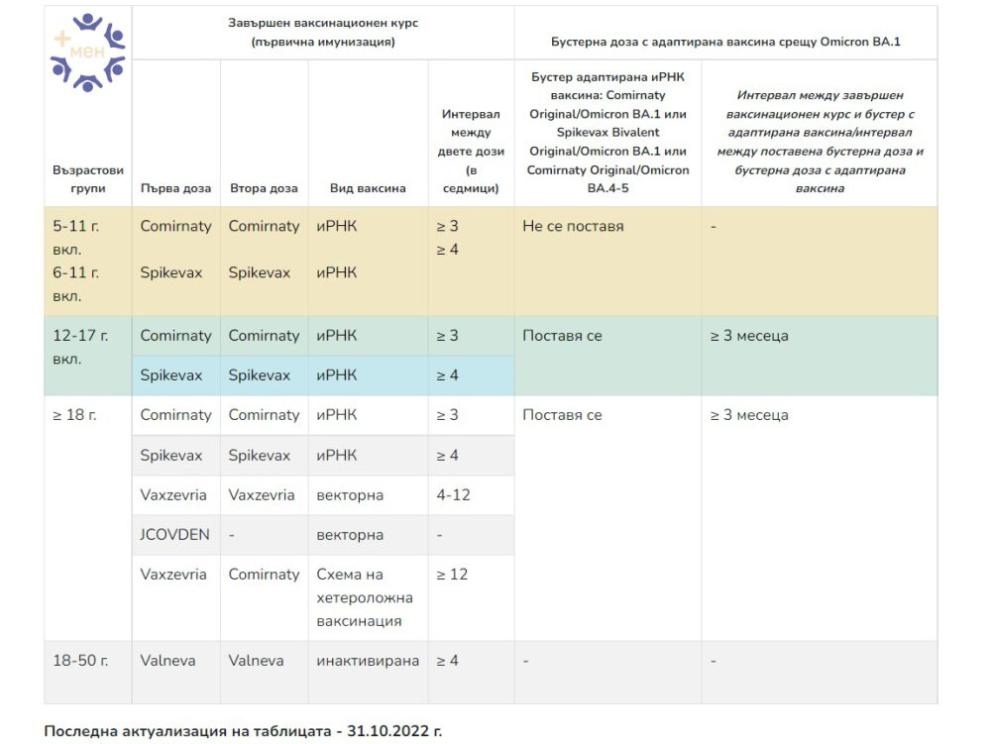Здравните власти публикуваха актуализирана таблица с възможните ваксинационни схеми при ваксините срещу COVID-19.